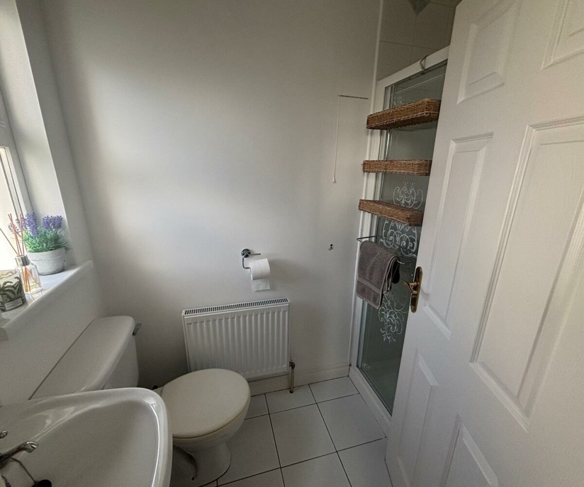 En-suite electric shower, toilet and wash basin; tiled floor and around shower