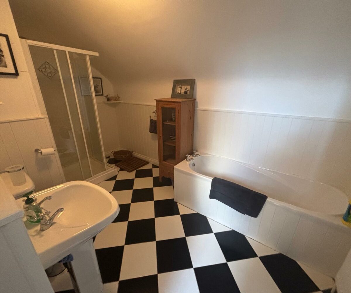 Bath, separate shower, toilet and wash basin; tiled floor; lower walls timber panelled