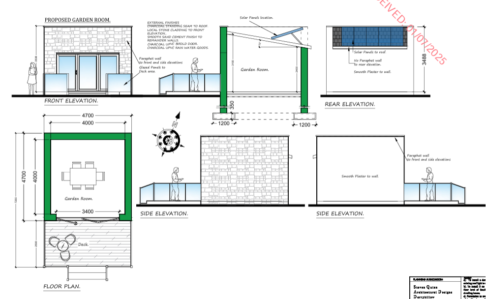 Planning Permission granted for a Detached Garden Room 4.0 m. x 4.0 m with decking at rear of garden (Planning Ref 25/61105)