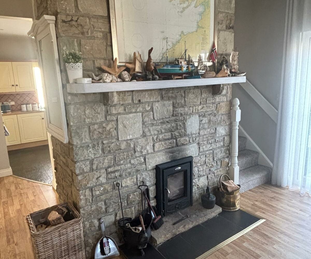 laminated floor; solid stone fire surround – ceiling height, with inserted stove