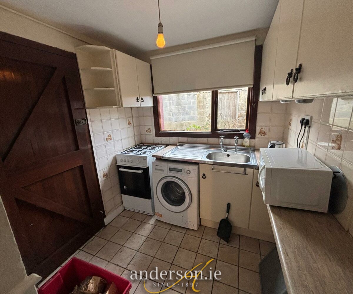 tiled floor; sink unit, plumbed for washing machine; door to rear