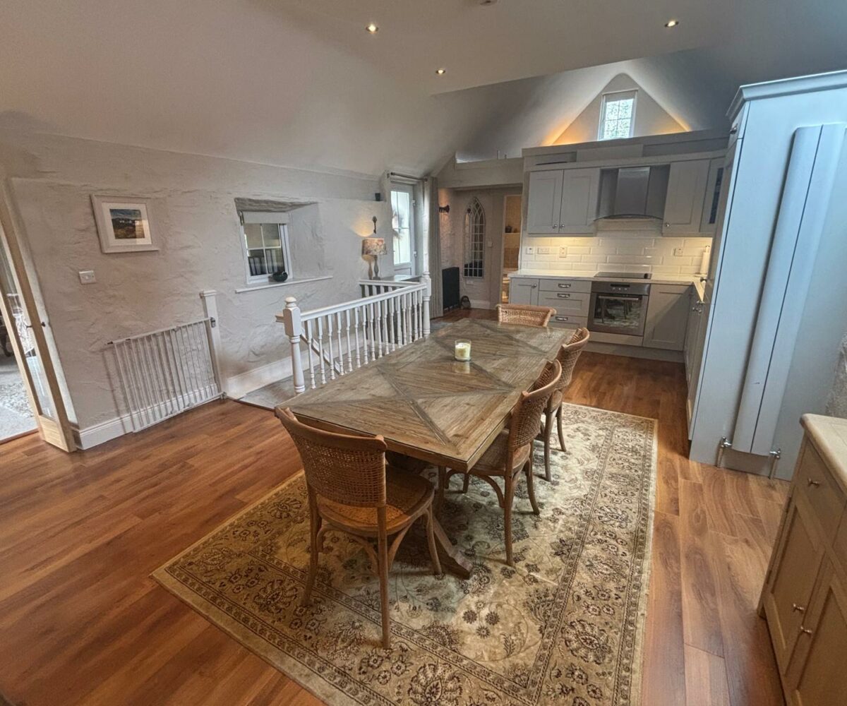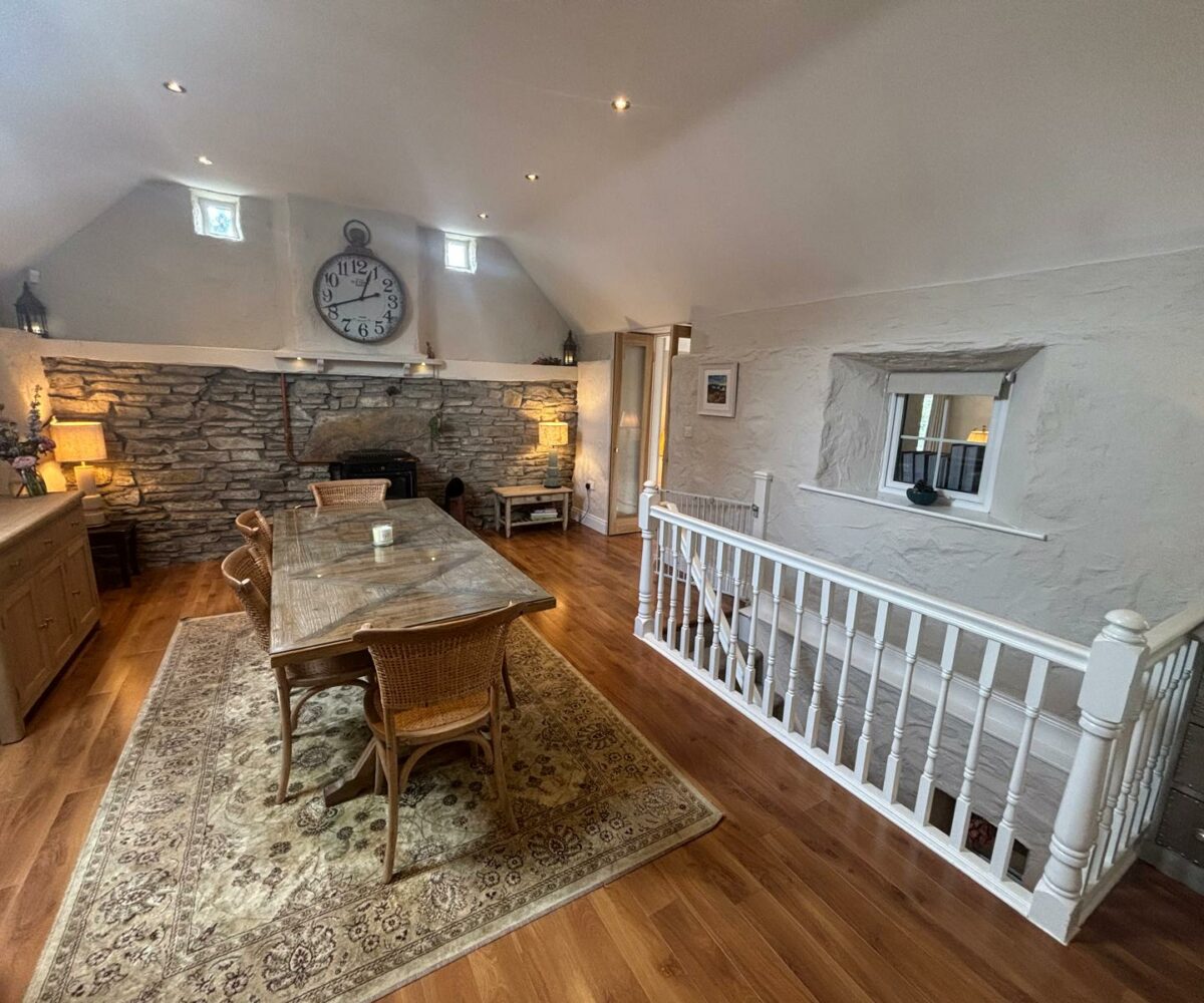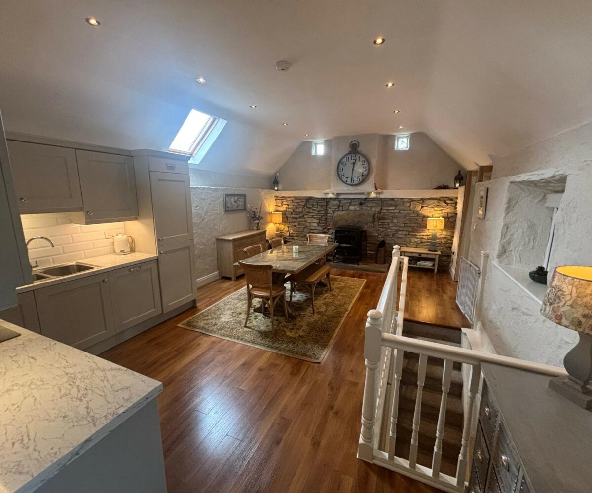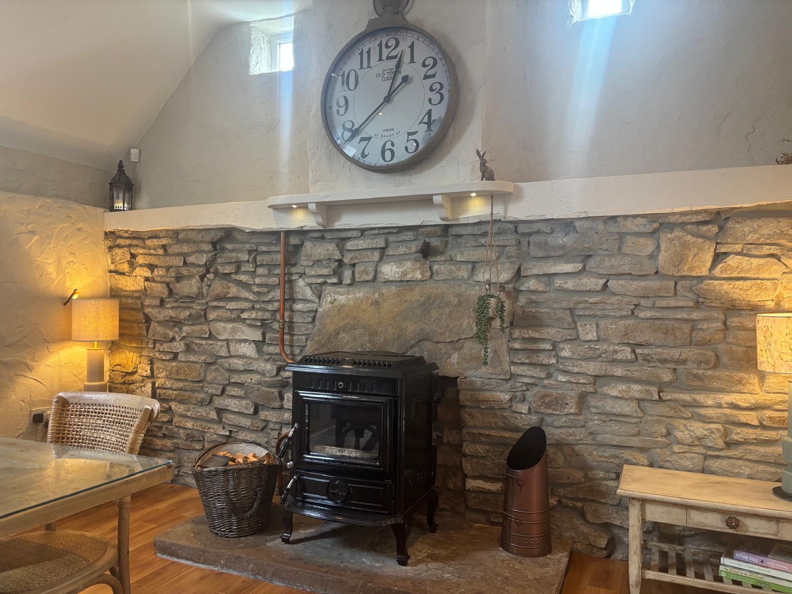 laminated floor; original stone wall surrounding solid fuel stove with back boiler; solid oak fitted units with integrated fridge freezer and dishwasher, stainless steel oven and electric hob; recess lighting