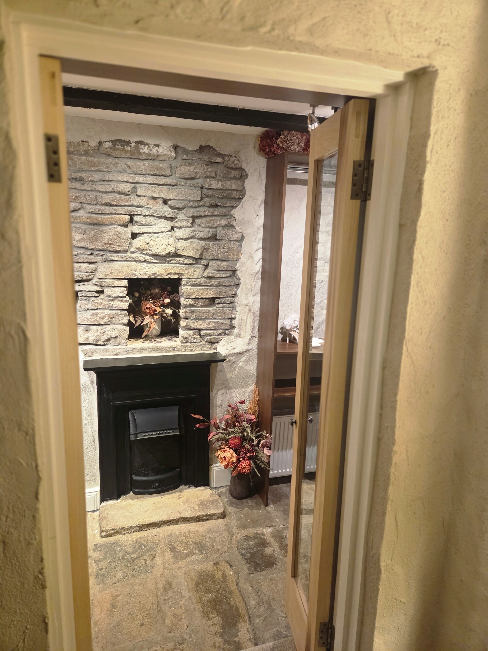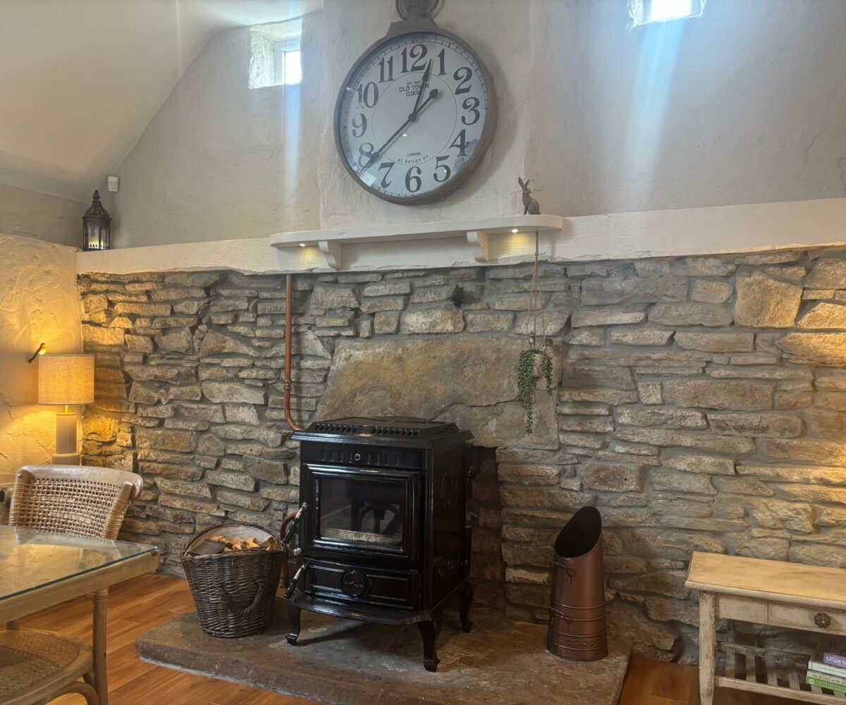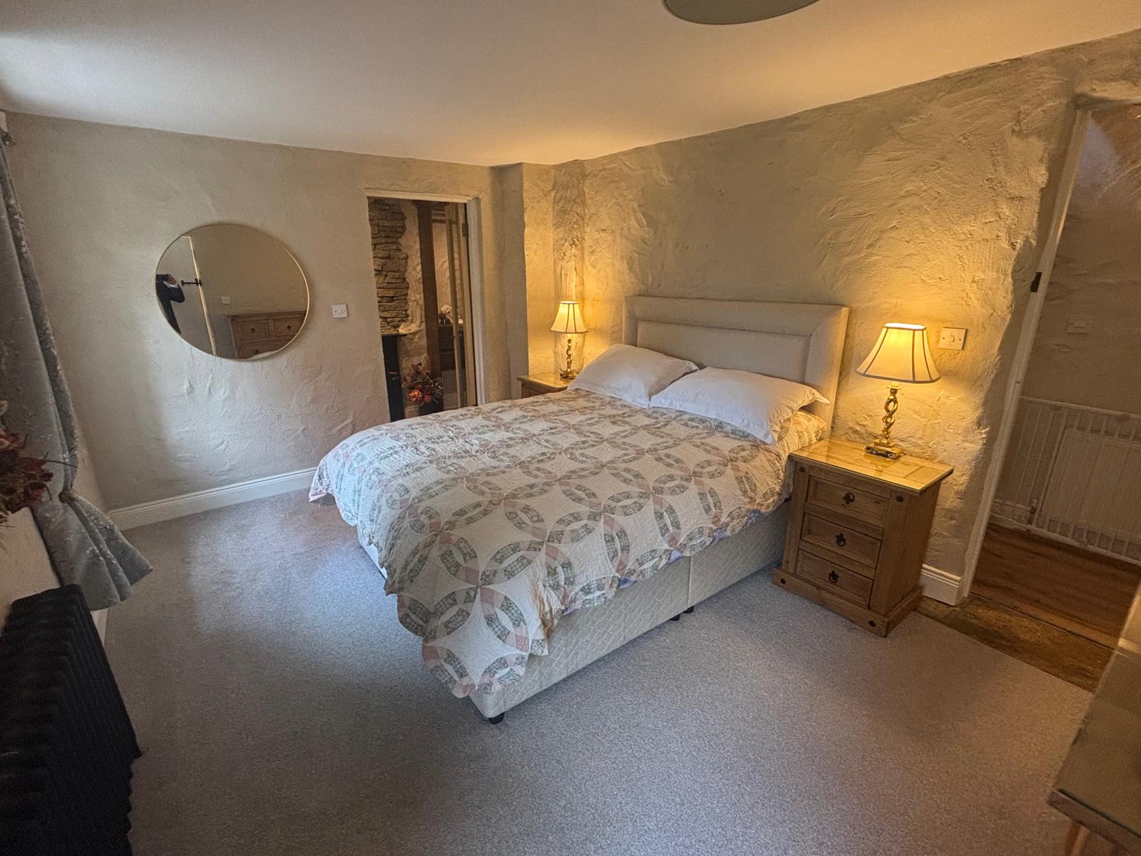 laminated floor; original stone wall surrounding solid fuel stove with back boiler; solid oak fitted units with integrated fridge freezer and dishwasher, stainless steel oven and electric hob; recess lighting