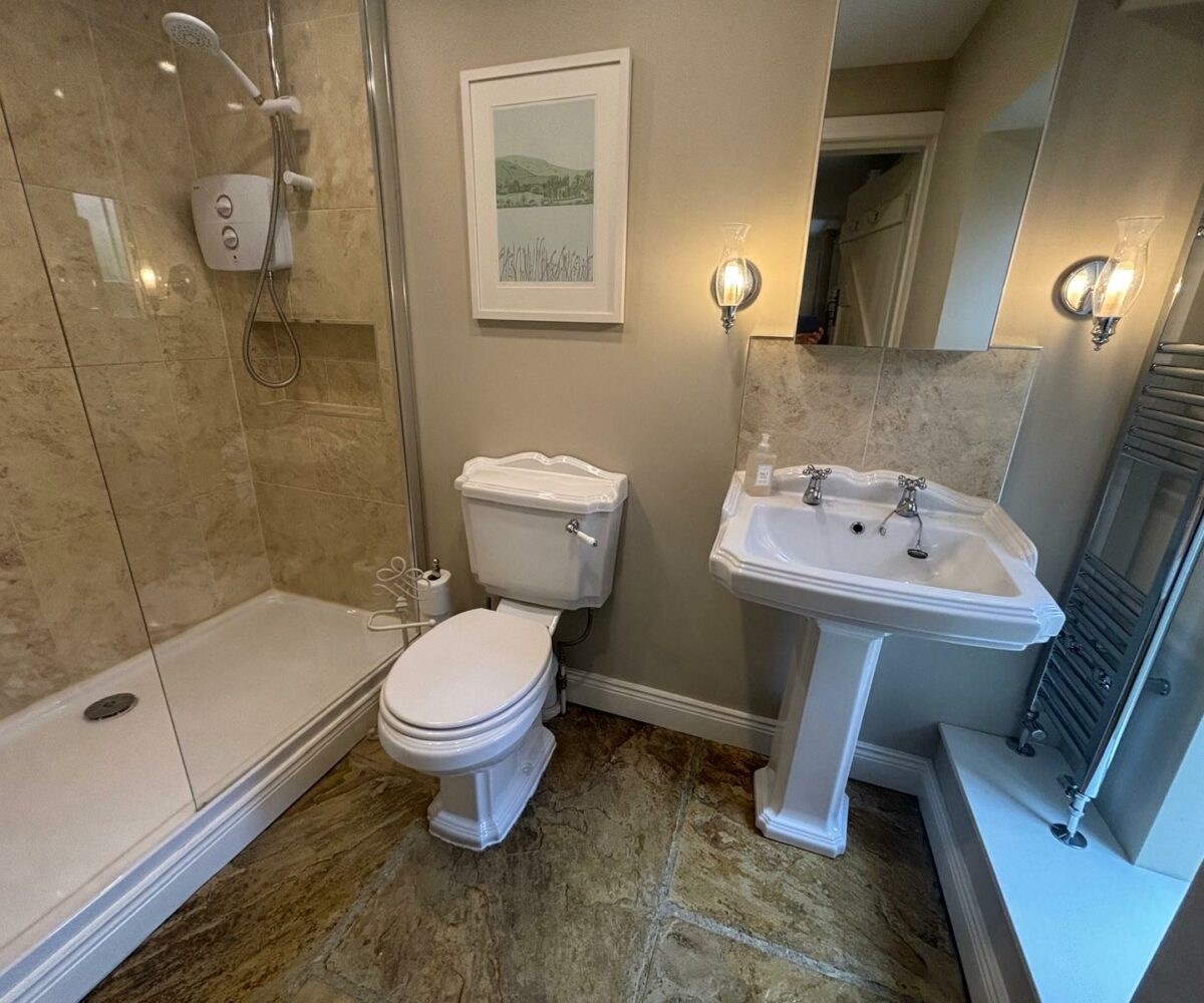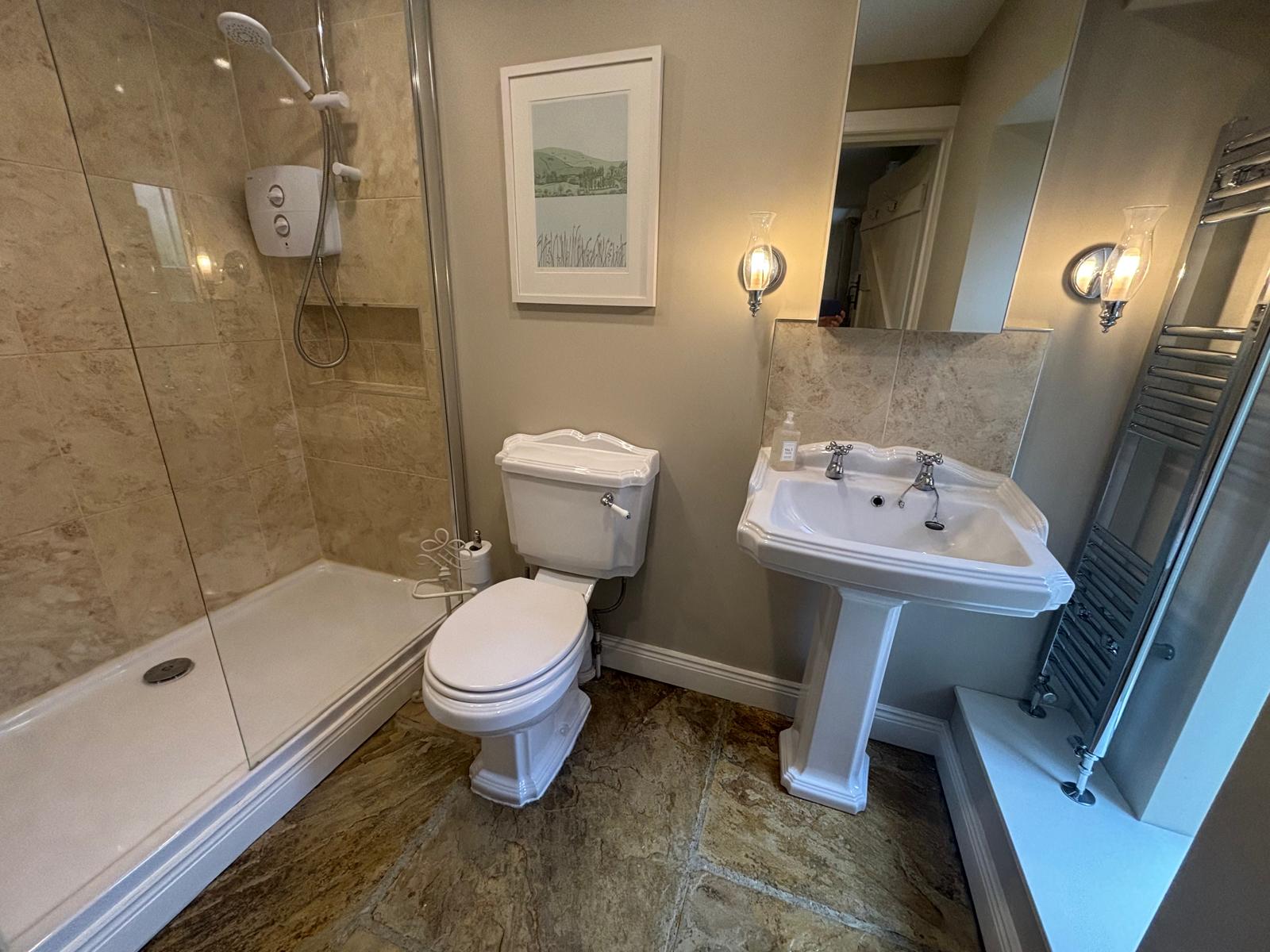 En-suite large electric shower, toilet and wash basin; stone flag floor