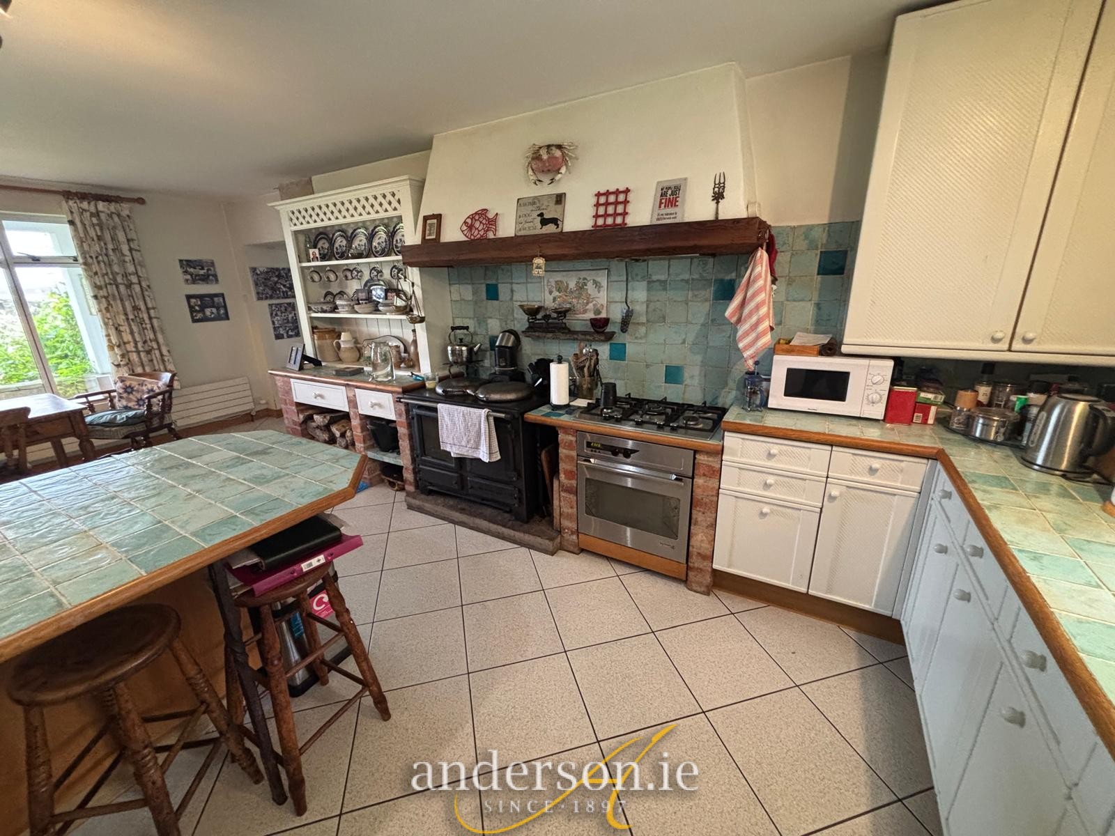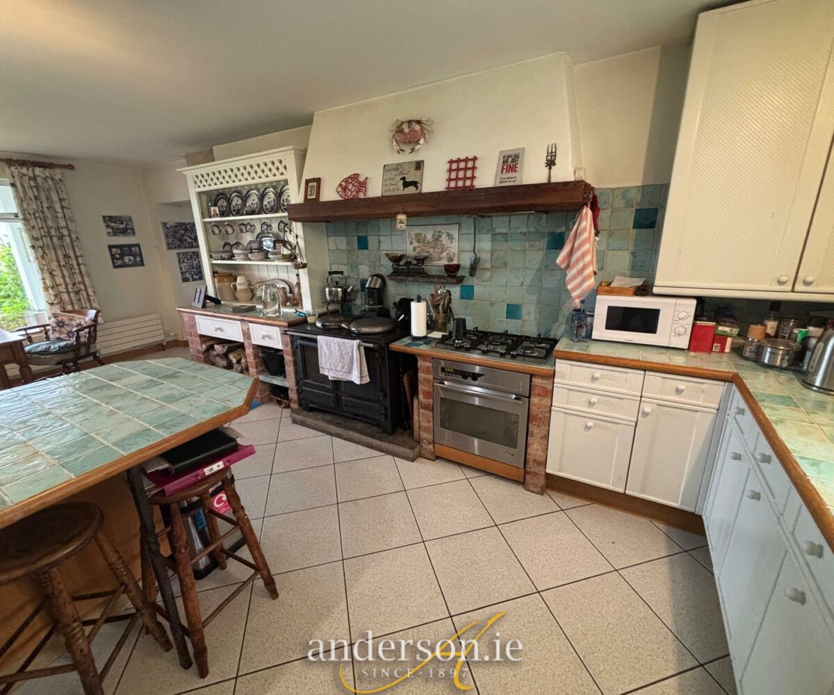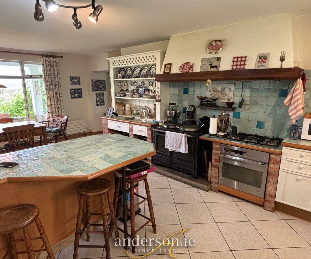 Fitted units with integrated fridge freezer; “Esse” solid fuel cooker, stainless steel oven and hob; breakfast counter