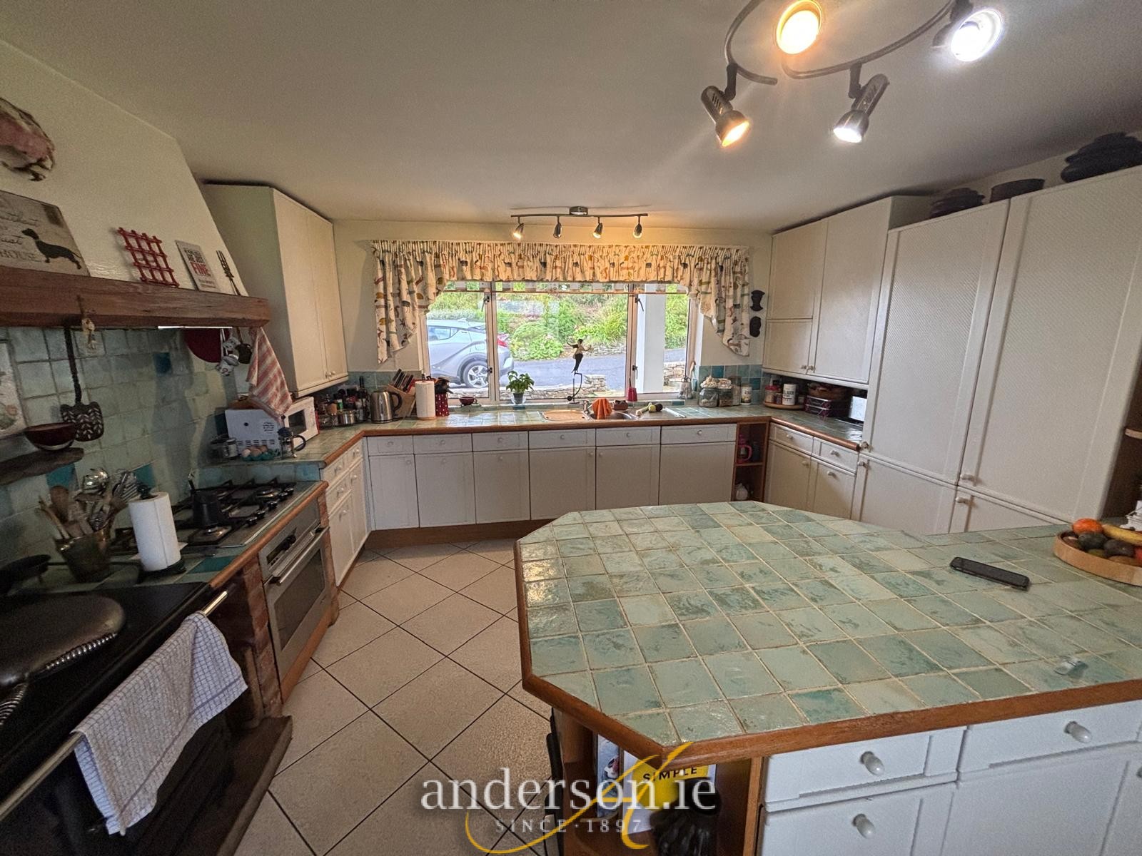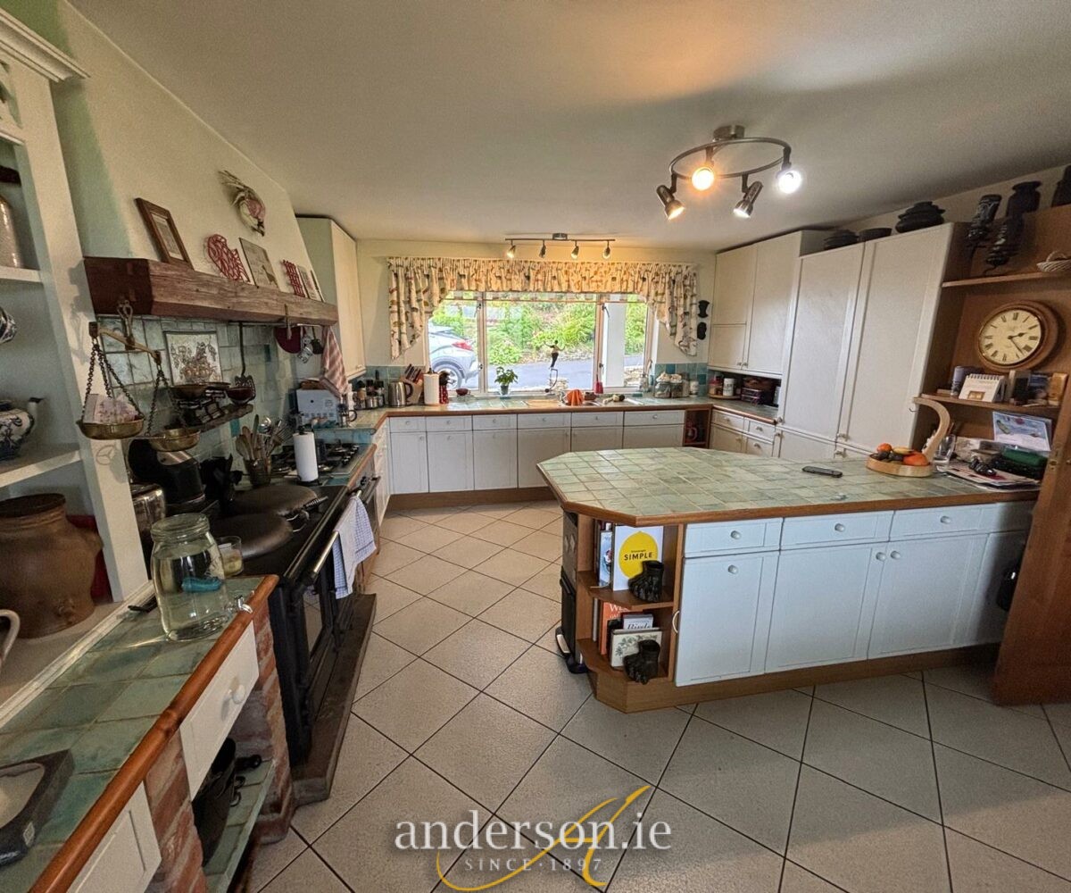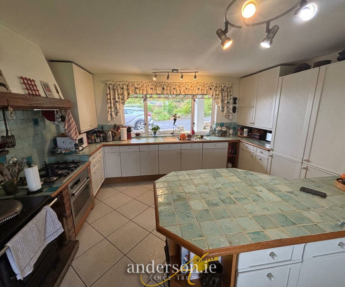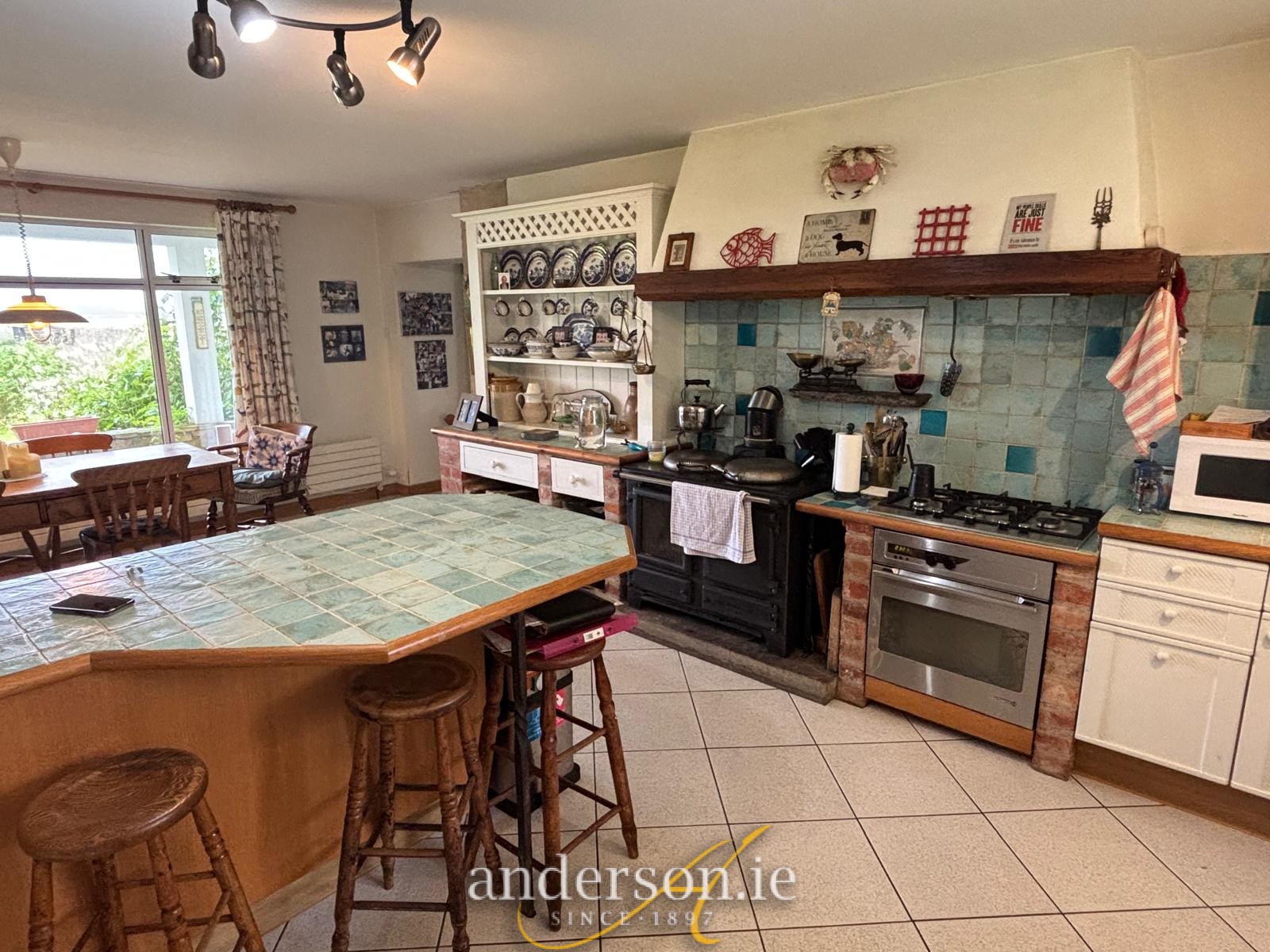 Fitted units with integrated fridge freezer; “Esse” solid fuel cooker, stainless steel oven and hob; breakfast counter